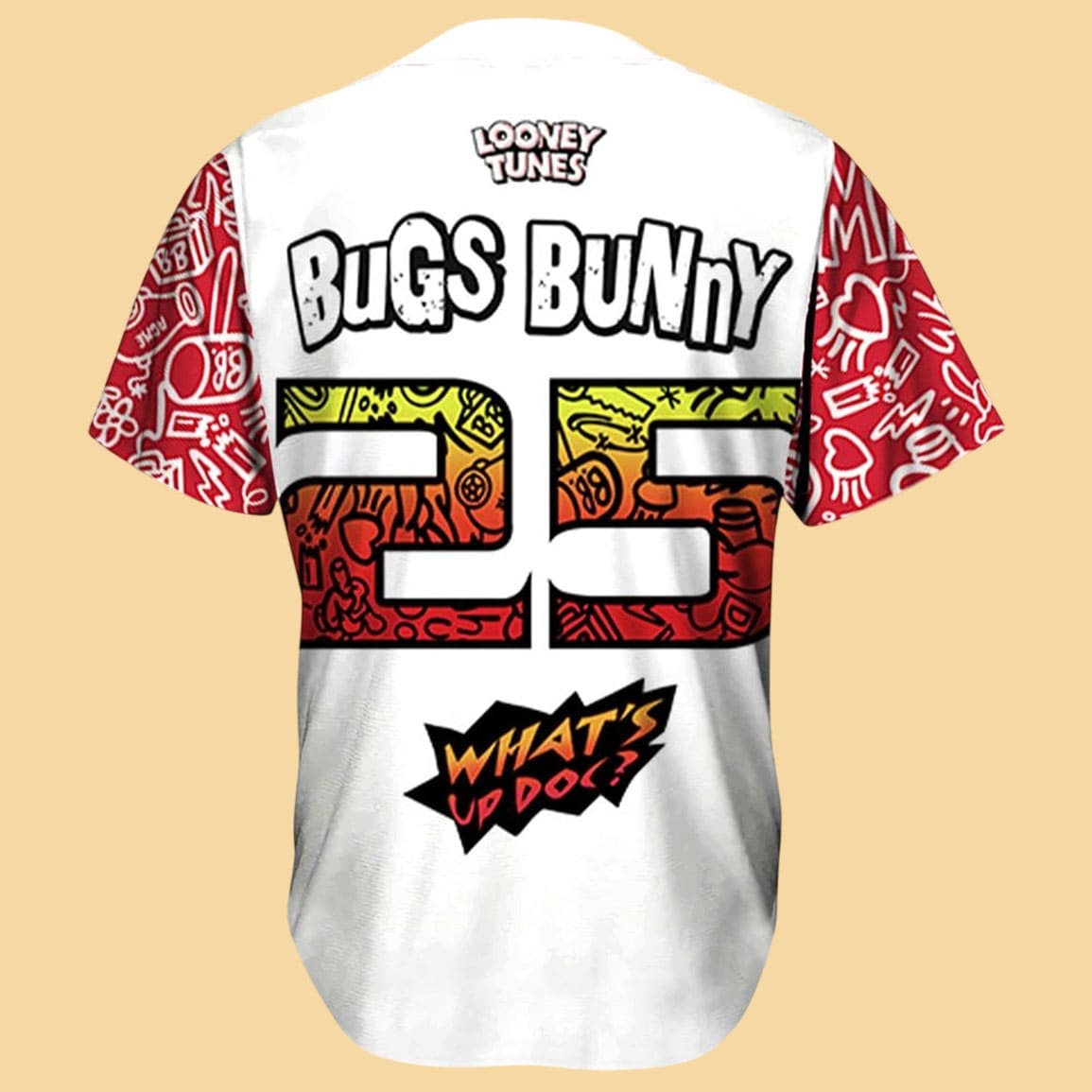 The jersey features a bold and vibrant design that captures the energy of Bugs Bunny in his classic baseball moment. The front showcases Bugs swinging a bat with his signature flair, while the sleeves are decorated with dynamic, cartoon-style artwork, including a playful "What's Up Doc?" bubble.