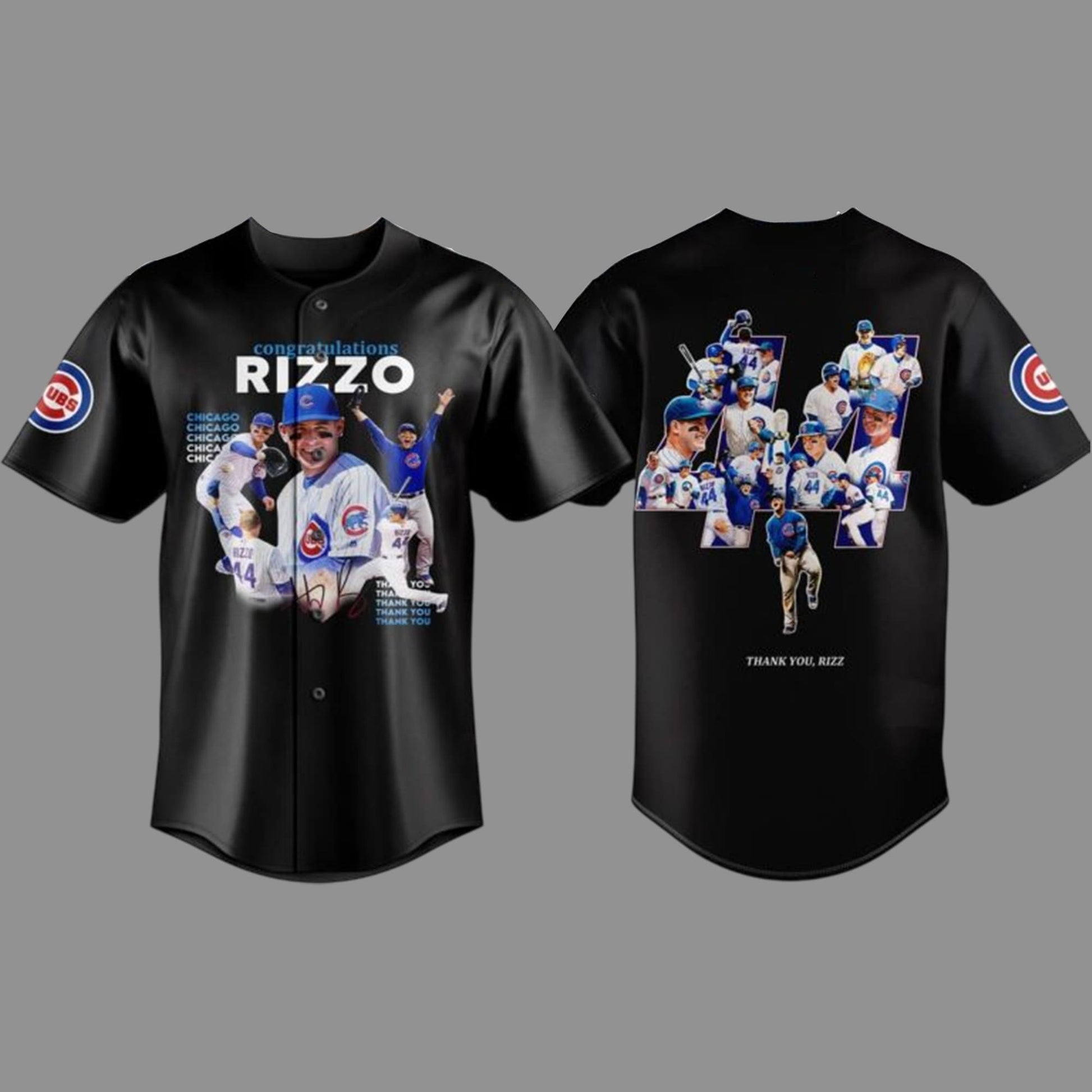 Celebrate a beloved #44 with the Anthony Rizzo Cubs Retirement Thank You Memories Jersey—a fan-made tribute featuring a front collage of career highlights and a bold “44” photo montage on the back with “THANK YOU, RIZZ.” Available in black, royal, and white, this button-front, curved-hem jersey brings nostalgia, style, and everyday comfort in one piece.