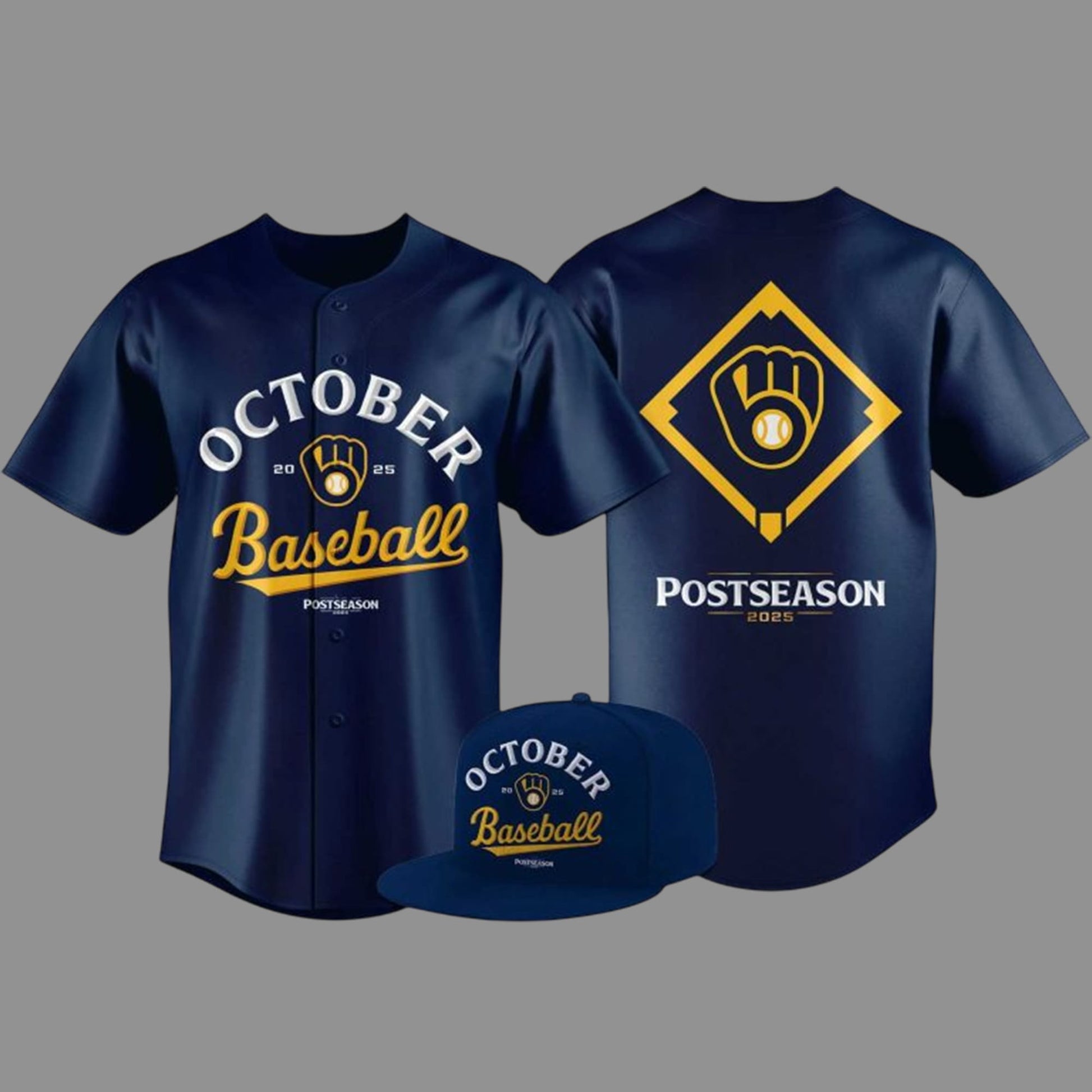 - Front print: “October Baseball 2025” with team crest; back print: large diamond logo and “Postseason 2025”