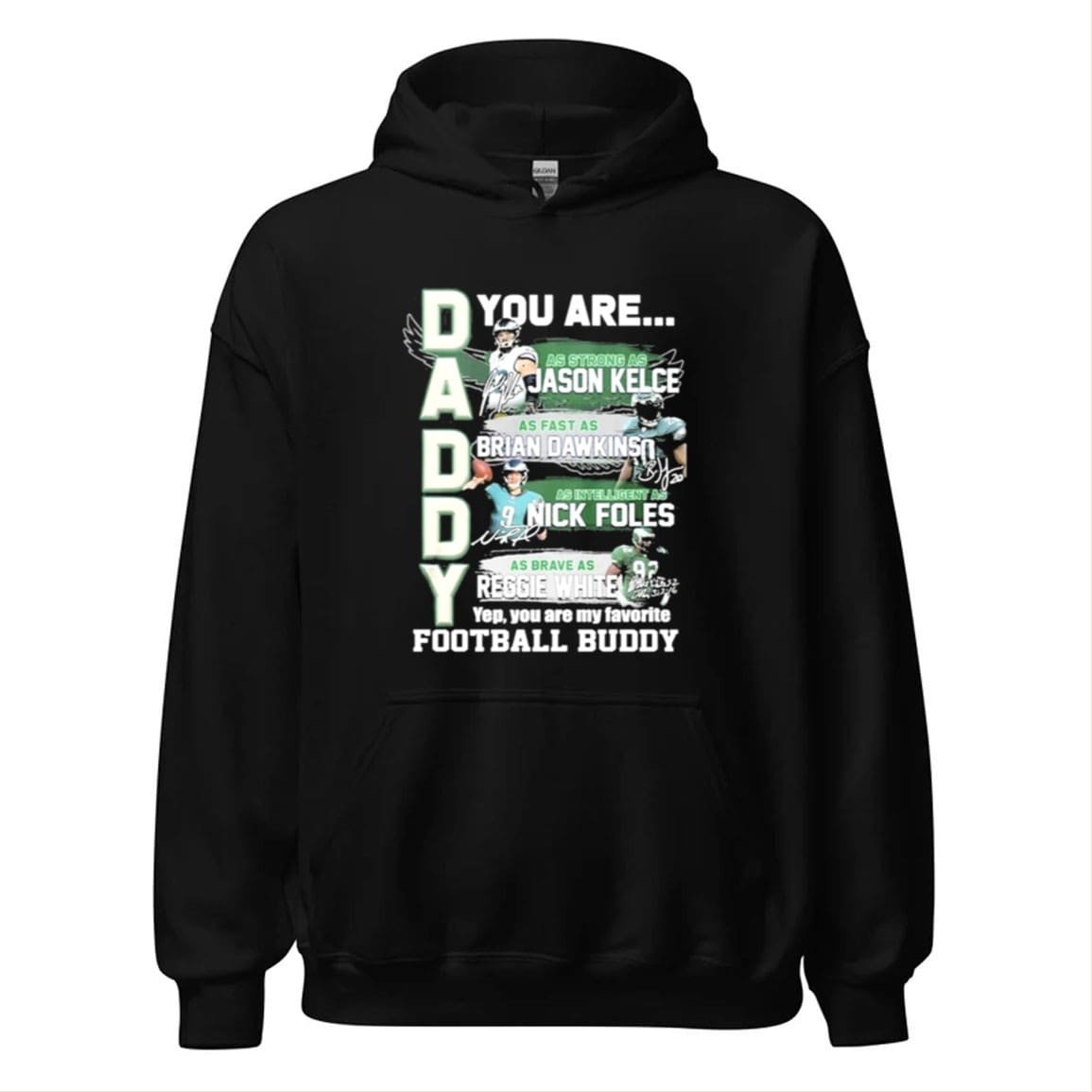 The design cleverly spells out “DADDY” with each letter representing legendary Eagles players: Jason Kelce for strength, Brian Dawkins for speed, Nick Foles for intelligence, and Reggie White for bravery. The result is a unique, story-driven graphic that feels custom-made for football families.
