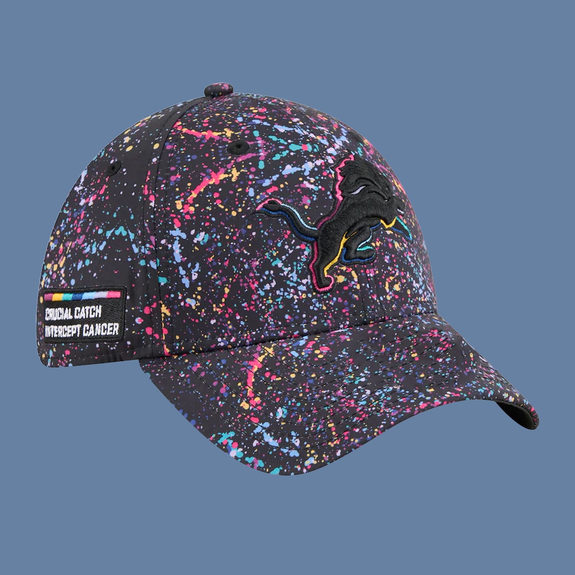 Celebrate awareness and standout style with the Lions 2025 Crucial Catch Hat. A bold, multicolor paint-splatter pattern wraps the crown and curved bill, paired with a high-quality embroidered lion patch and a side “Crucial Catch – Intercept Cancer” detail for a powerful message.