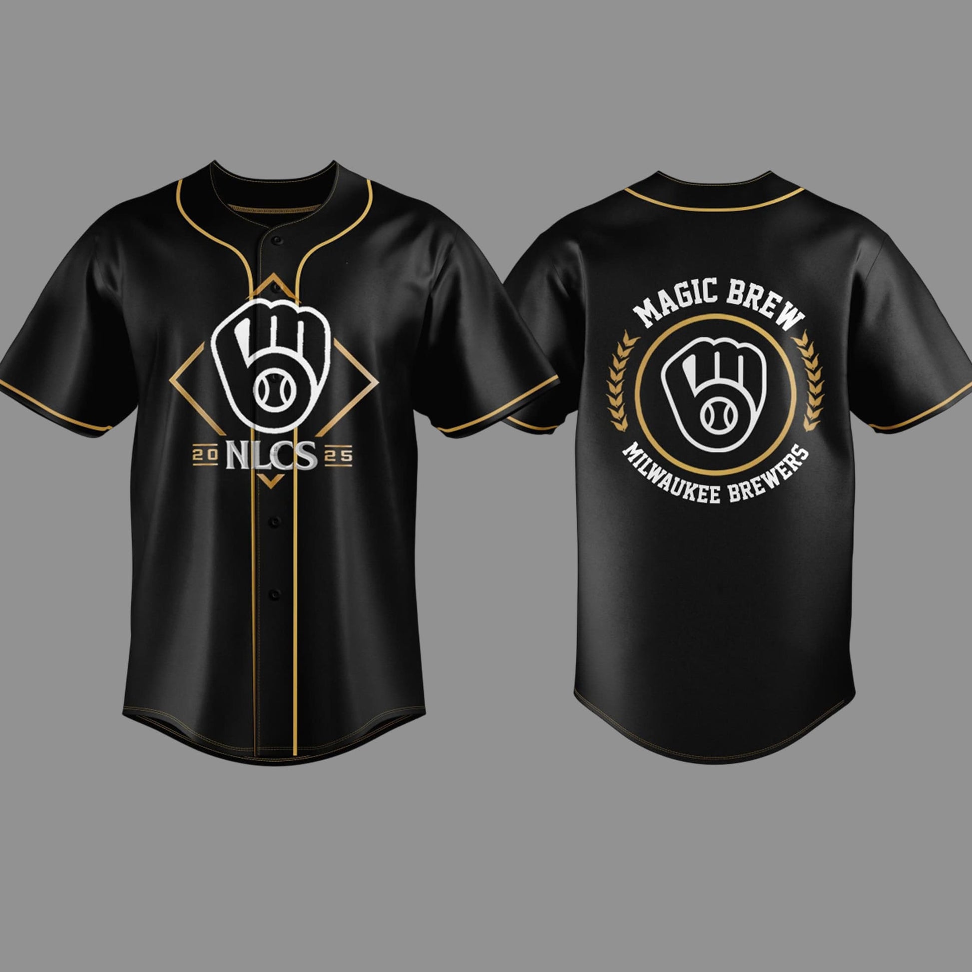 Celebrate a magic run with the Milwaukee Brewers 2025 NLCS Champions Locker Room Jersey. This button-front jersey features a bold NLCS 2025 front crest framed by a diamond outline and clean contrast piping. The back showcases a circular “MAGIC BREW – MILWAUKEE BREWERS” emblem for a statement finish. Available in black or navy with gold accents; unisex fit S–5XL.