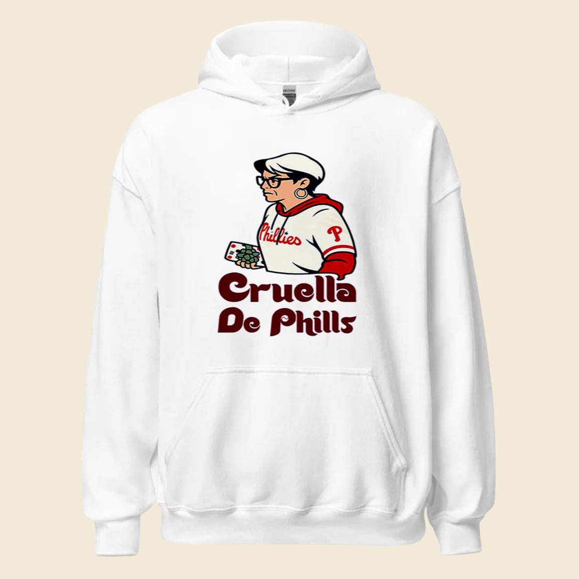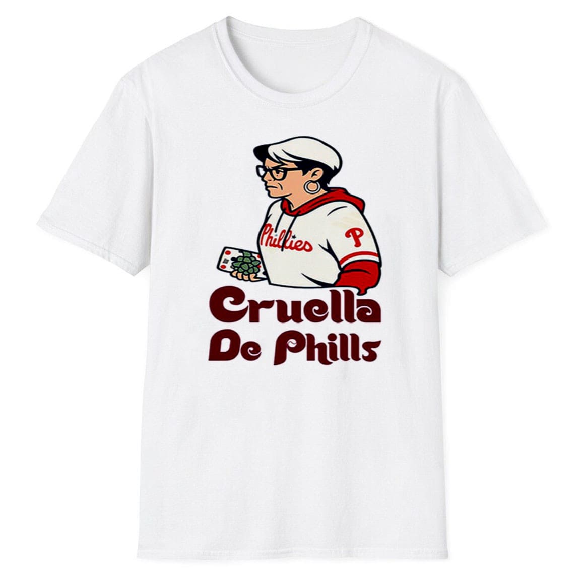 Featuring a cartoon-inspired character styled with a Phillies jersey and a confident attitude, the “Cruella De Phills” artwork brings a playful yet edgy vibe. It’s the kind of shirt that sparks conversation and shows off not just your loyalty to the Phillies, but also your sense of humor. The bold lettering in deep red adds contrast to the crisp white base, ensuring the graphic really pops.