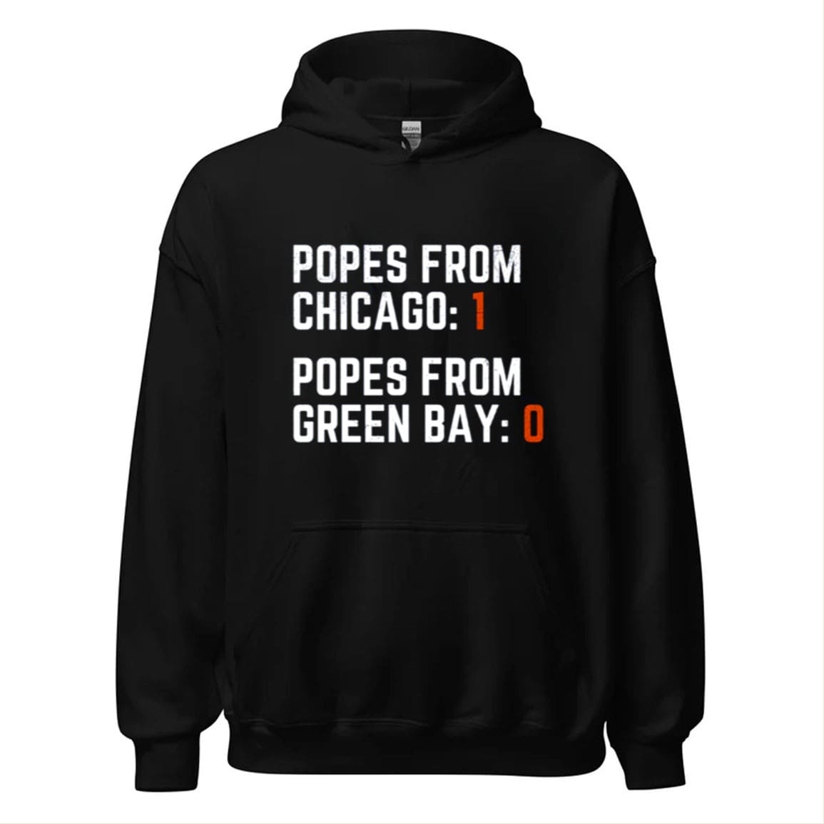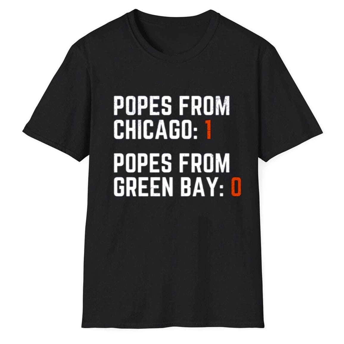 The bold text, “POPE FROM CHICAGO: 1, POPE FROM GREEN BAY: 0,” makes a statement that's sure to catch attention and spark conversation. Ideal for sports fans, this shirt serves as a humorous nod to both the competitive spirit of sports and a lighthearted take on rivalry. Made with premium quality materials, it’s perfect for everyday wear.
