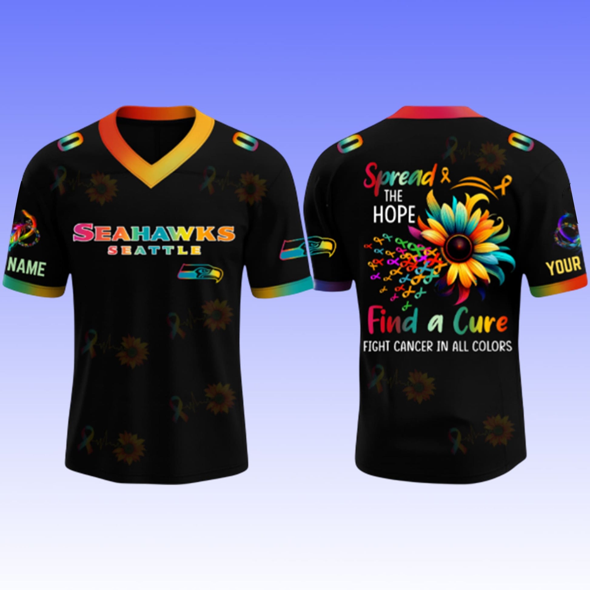 - Design: Featuring the Seahawks logo in vibrant colors, this jersey showcases colorful cancer awareness ribbons and a sunflower symbolizing hope. The back reads “Spread the Hope, Find a Cure” along with the message “Fight Cancer in All Colors,” representing unity in the fight against cancer.