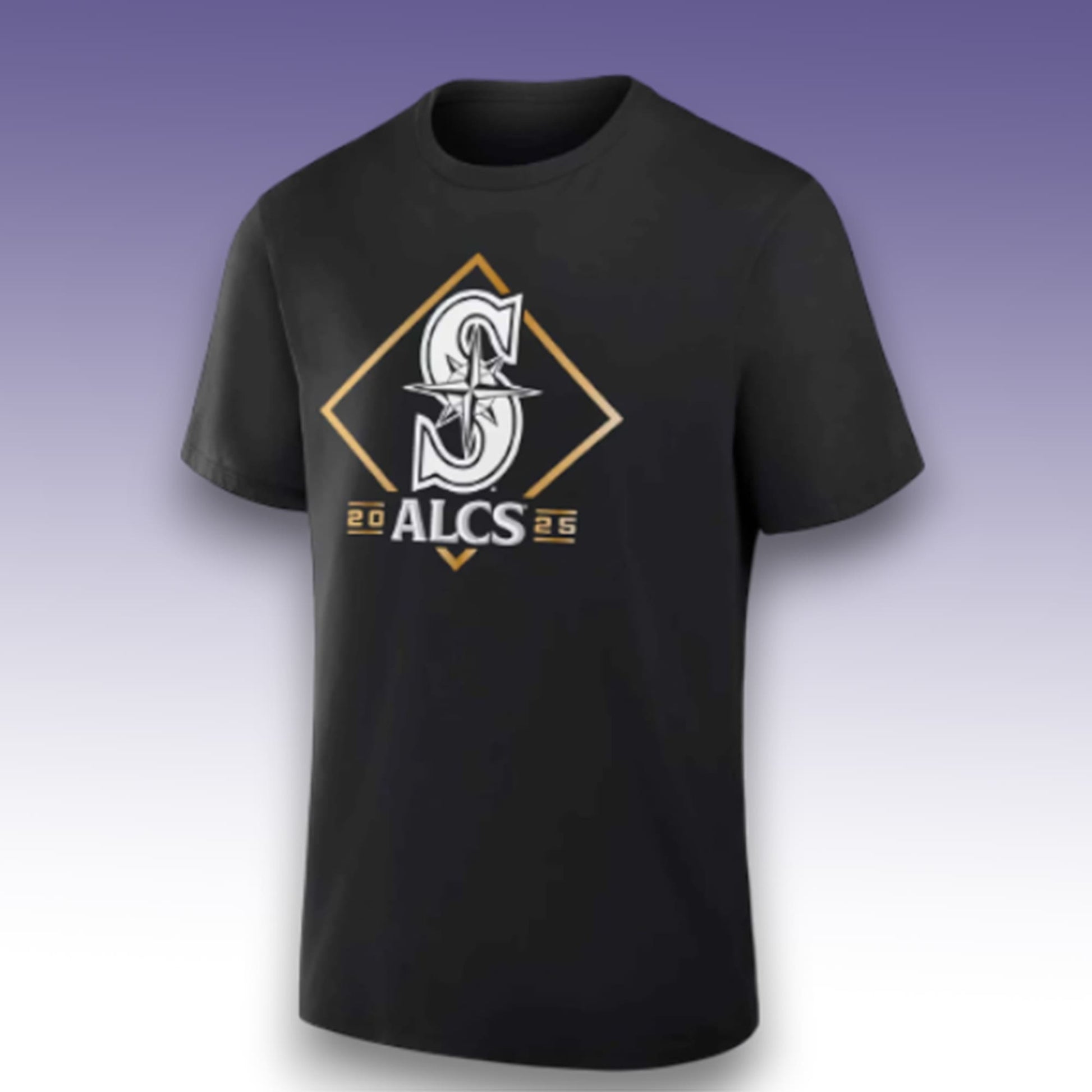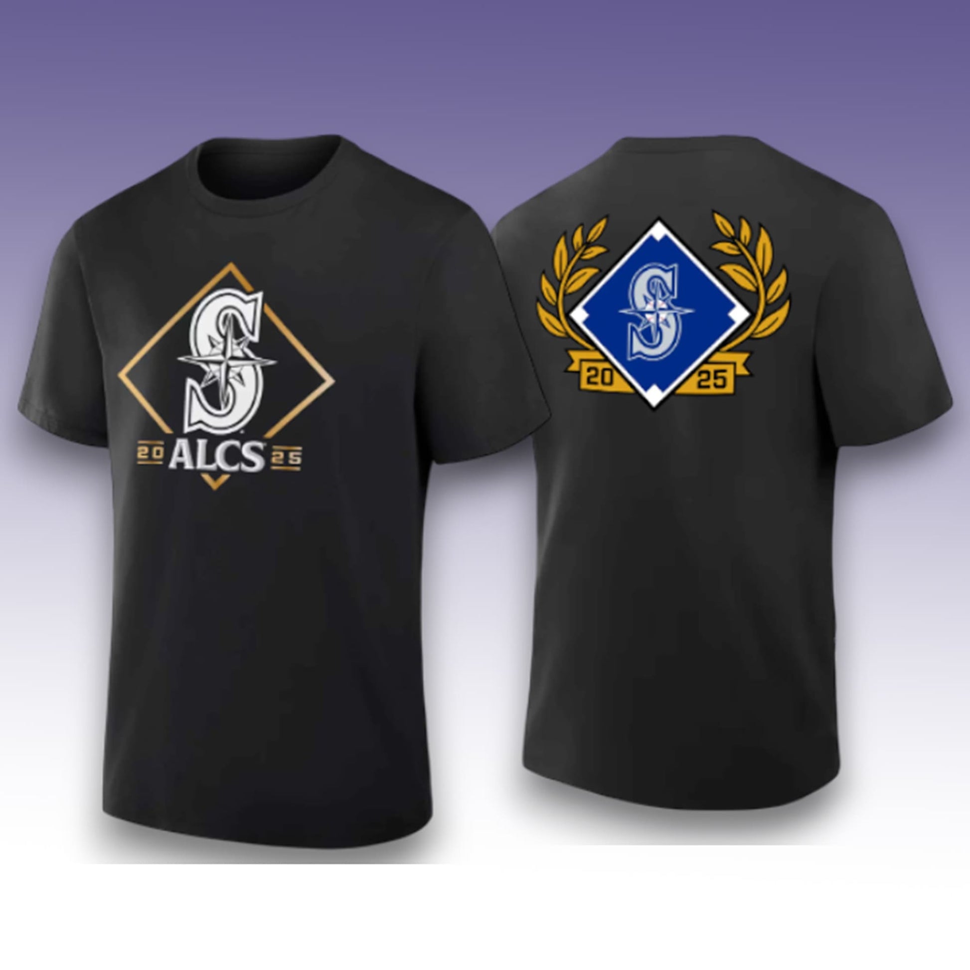 Celebrate the series win with the Seattle Mariners 2025 ALCS Champions Locker Room Shirt. The front features a bold “S” inside a postseason diamond with “ALCS 2025,” while the back showcases a laurel-wreathed 2025 crest—just like the tees players wear during the celebration.