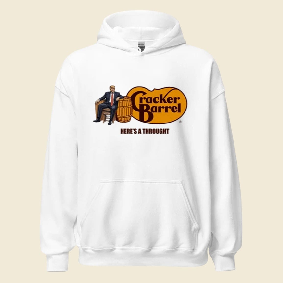 - Unique Design: Features a playful parody of the Cracker Barrel logo paired with a caricature-style Trump graphic and the bold phrase “Here’s A Thought.”